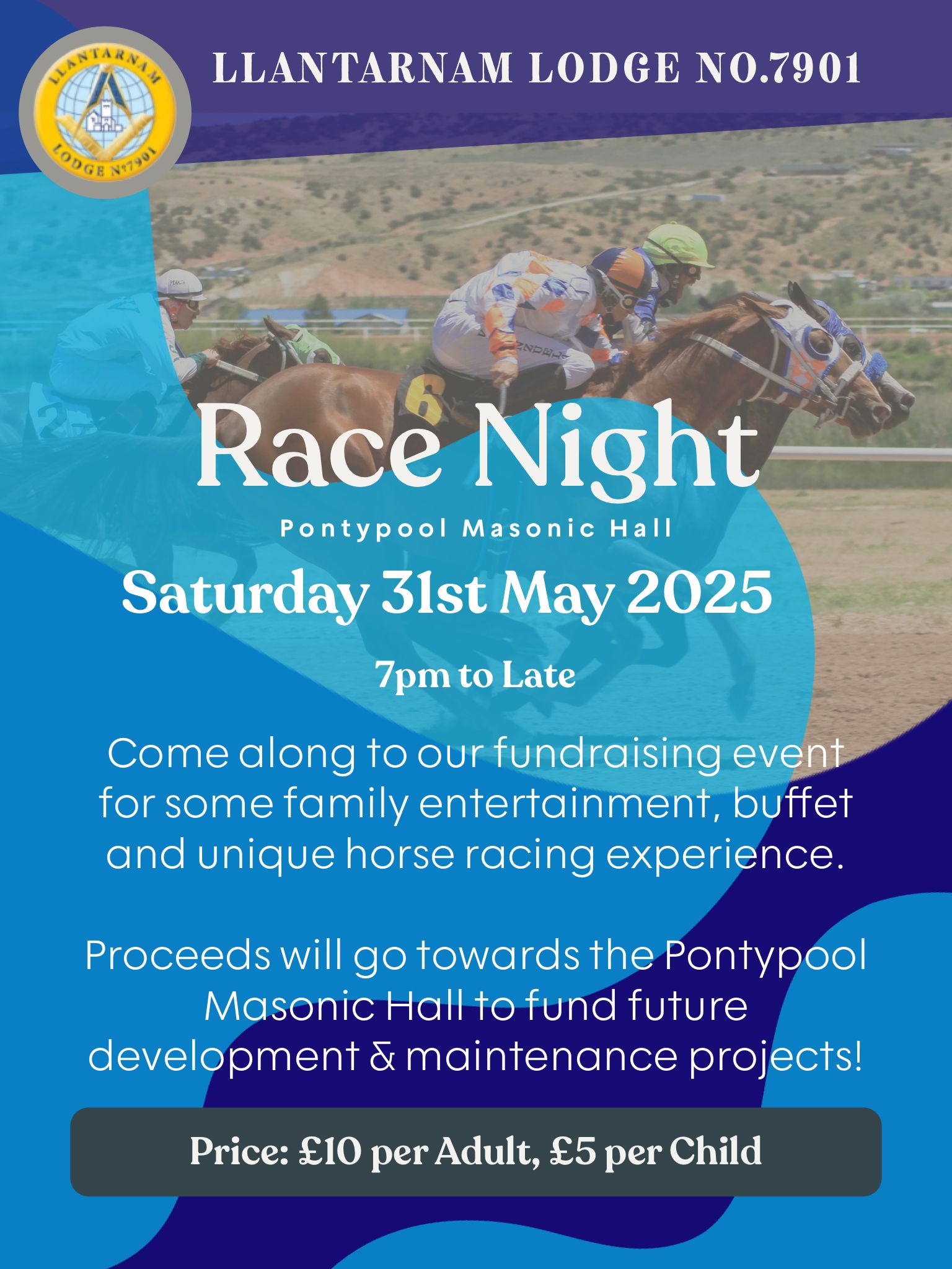 Saturday evening Llantarnam Lodge hosted their annual Horse Racing Night. A family friendly event open to members, their families and non Masonic friends to enjoy the sociable side of Freemasonry, while raising vital funds for the Masonic Hall. Everyone had a fantastic evening and to quote the Worshipful Master, Richard Beavan: